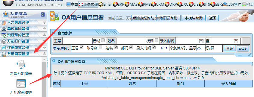 請問工作流和萬能魔表兩個管理模塊的自定義SQL數據源如何實現排序效果?現在總是報錯80040e14,除非另外還指定了TOP或FORXML,否則ORDERBY子句在視圖、內聯函數、派生表、子查詢和公用表表達式中無效。?這個提示很清楚,就是自定義的SQL語句有語法錯誤,當在自定義的SQL中使用了orderby自定義排序時,...