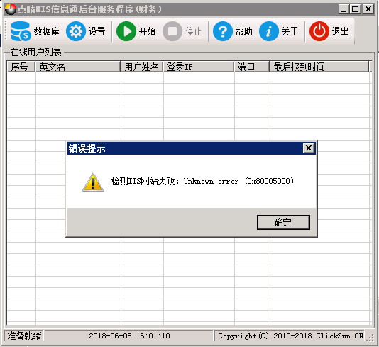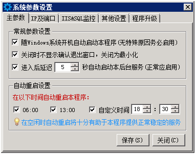 以上端口沒(méi)有特殊原因的話,不應(yīng)該頻繁改動(dòng),否則會(huì)導(dǎo)致用戶PC客戶端連接異常,一般保持默認(rèn)的58000即可; 文件和信息傳輸端口設(shè)置為2425即可,更改為其他端口后將導(dǎo)致本程序無(wú)法兼容飛鴿傳書(shū)、飛秋等同類(lèi)軟件,但可以確保在同一臺(tái)電腦上點(diǎn)晴MIS信息通PC客戶端與此類(lèi)軟件共存并正常運(yùn)行。 ![]() 以上設(shè)置用于確保服務(wù)于點(diǎn)晴OA的IIS和SQL Server正常運(yùn)行。 開(kāi)啟方法: 1、點(diǎn)擊“重啟IIS及SQL腳本文件位置”的“測(cè)試”按鈕,確保腳本執(zhí)行正常,如果不正常可以自行修改該腳本文件,具體內(nèi)容可以自行百度相關(guān)知識(shí); 2、點(diǎn)擊“IIS允許狀態(tài)監(jiān)視參數(shù)”-》“點(diǎn)晴網(wǎng)站”,選擇點(diǎn)晴MIS系統(tǒng)所在的網(wǎng)站,如果啟用了多端口,則需要自行修改“端口”為正確的端口,然后點(diǎn)擊“測(cè)試”按鈕,看看頁(yè)面返回值是否是“IIS&SQL_OK.”,必須是這個(gè)才是正確的; 3、在“在以下時(shí)間自動(dòng)重啟IIS和SQL Server”中,根據(jù)本單位上班時(shí)間勾選合適的自動(dòng)重啟時(shí)間,一般不沖突的話,就應(yīng)該全部勾選; 4、點(diǎn)擊“保存”按鈕后生效。 如果OA服務(wù)器的IIS和SQL Server是放在兩臺(tái)不同的服務(wù)器上,那么本項(xiàng)目應(yīng)該關(guān)閉不用。 關(guān)閉方法: 清空“重啟IIS及SQL腳本文件位置”、將將檢測(cè)間隔設(shè)置為0、“在以下時(shí)間自動(dòng)重啟IIS和SQL Server”全部取消。 如果進(jìn)入以上頁(yè)面提示以下錯(cuò)誤: